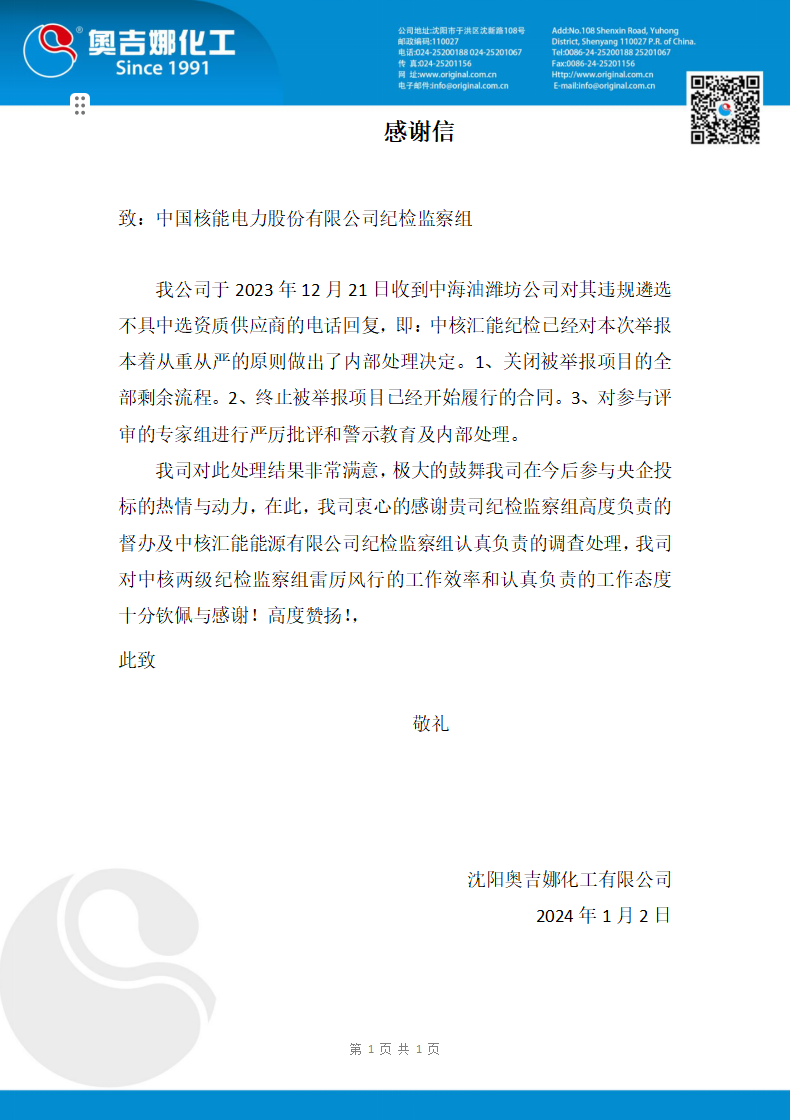 摘要:奧吉娜公司寫給中國核能電力股份有限公司紀檢監察組的一封感謝信……