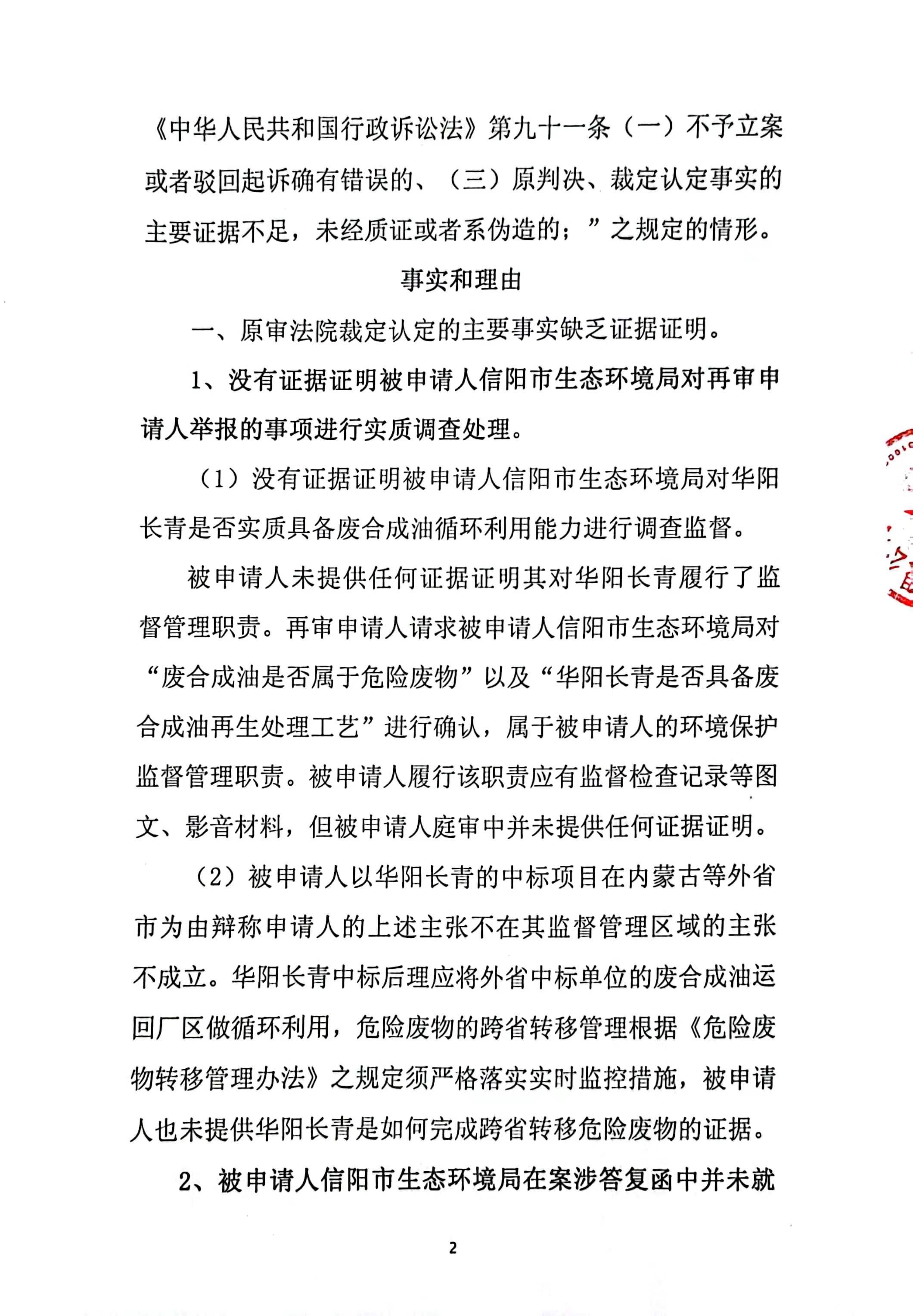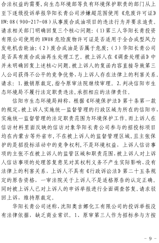 2、一審訴訟請求:請求人民法院判決撤銷被告作出的《信陽市生態(tài)環(huán)境局關(guān)于沈陽奧吉娜化工有限公司舉報(bào)華陽長青投資有限公司違法經(jīng)營及固始分局不作為、亂作為等問題調(diào)查處理的函》;責(zé)令被告對原告向被告舉報(bào)華陽長青投資有限公司事項(xiàng),限期進(jìn)行重新調(diào)查和答復(fù);判令被告認(rèn)定的廢合成油不應(yīng)按危險(xiǎn)廢物有關(guān)規(guī)定進(jìn)行管理違反法律規(guī)章規(guī)定,無效。