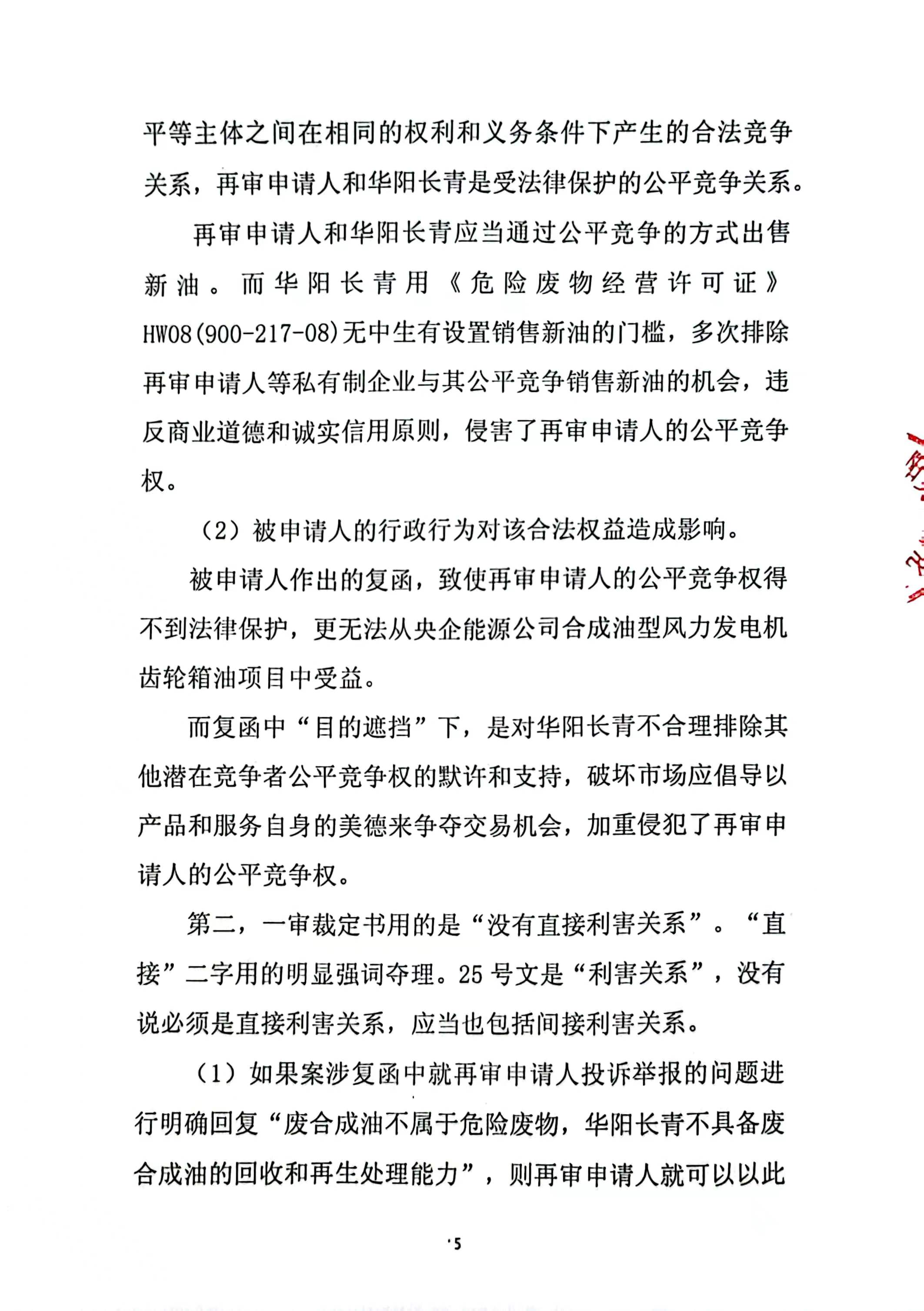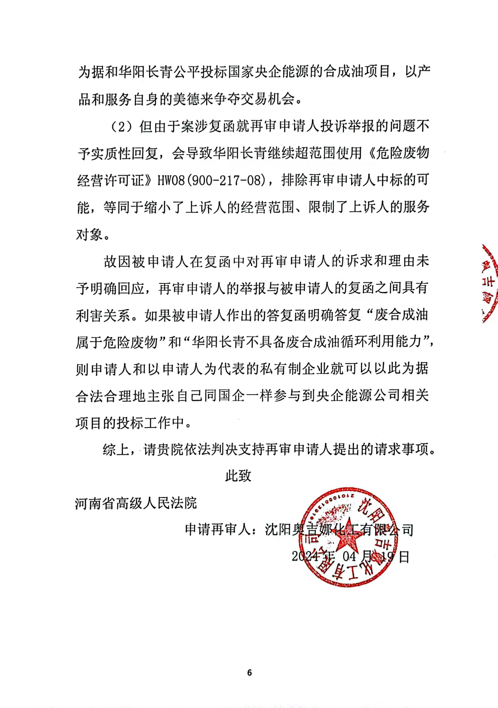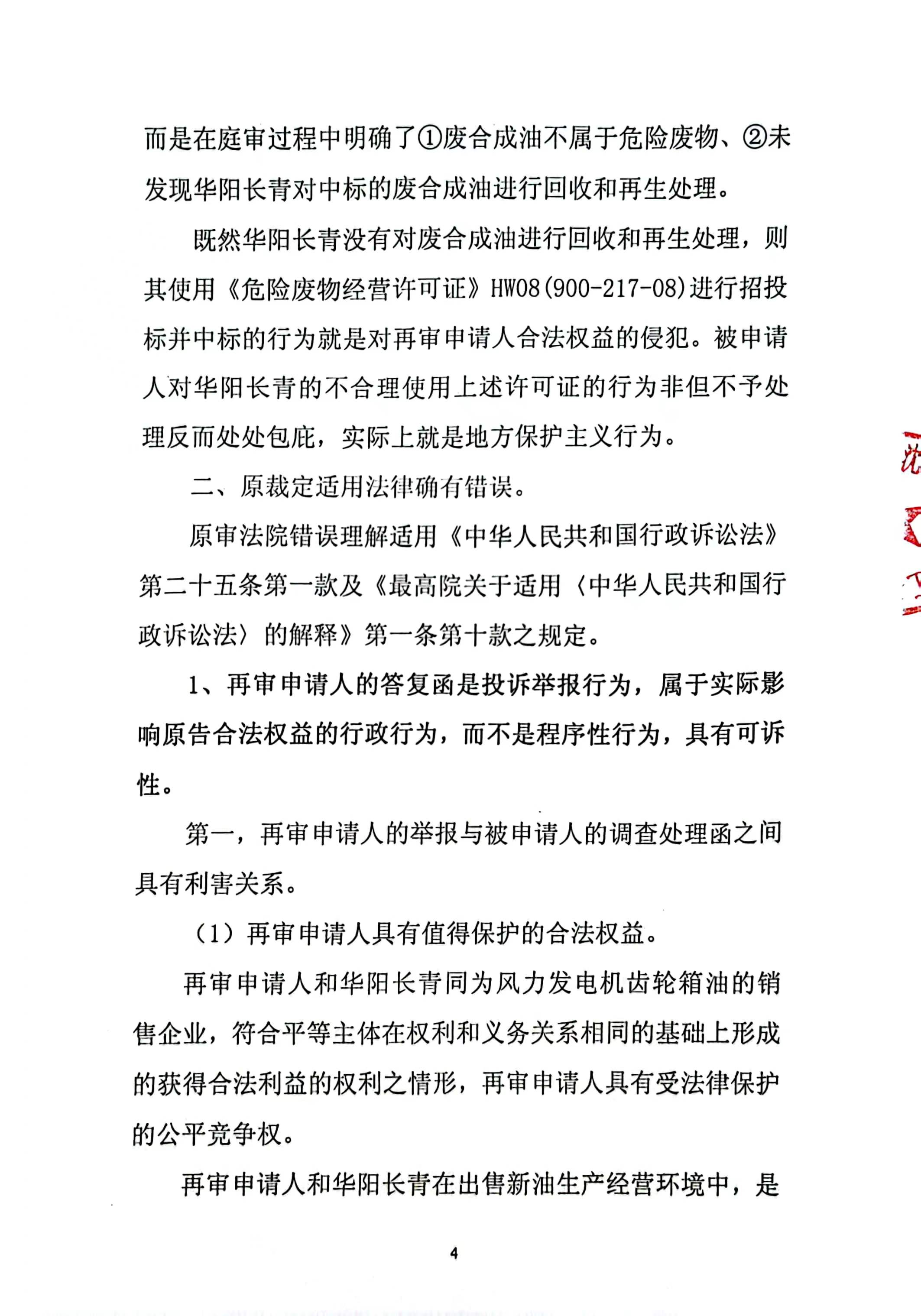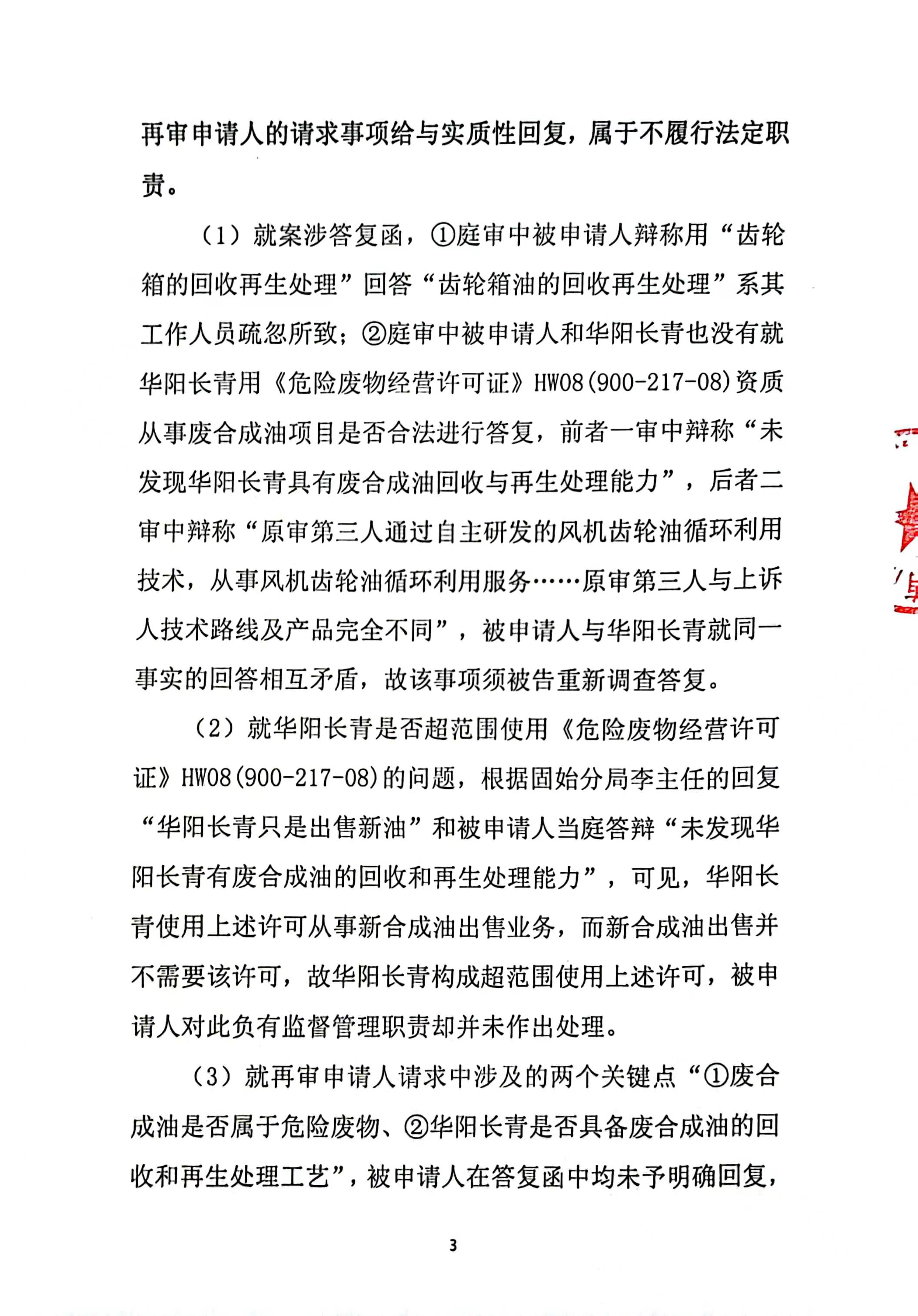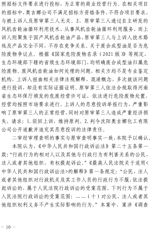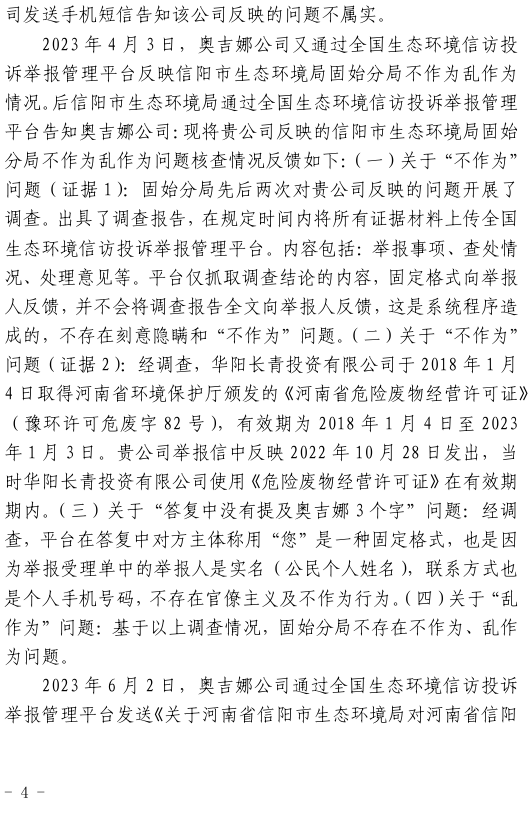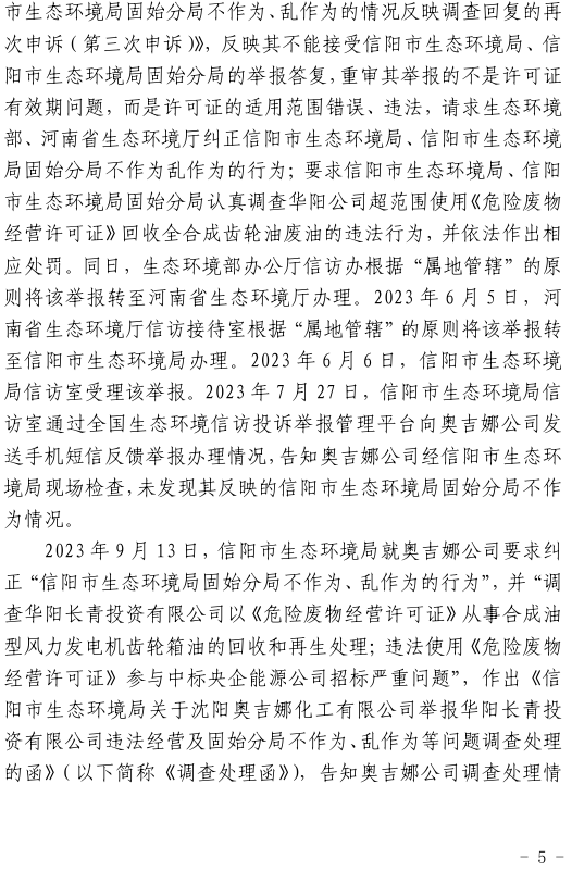 2023年3月9日,奧吉娜公司收到固始分局通過12369環(huán)境信訪平臺的短信答復(fù):“反映問題不屬實(shí)”。3月10日,奧吉娜公司向固始分局負(fù)責(zé)人電話詢問,其解釋稱:經(jīng)調(diào)查核實(shí),華陽長青公司沒有再生風(fēng)電潤滑油銷售,出售的是新油。否定了奧吉娜公司的舉報(bào)內(nèi)容。對此,奧吉娜公司表示強(qiáng)烈不滿。3月11日,奧吉娜公司向環(huán)境部投訴固始分局的不作為和亂作為。2023年5月26日,奧吉娜公司收到12369環(huán)境信訪平臺的短信答復(fù)。答復(fù)部門為信陽環(huán)境局。令人啼笑皆非的是,答復(fù)稱,華陽長青的許可證有效期沒有問題,與舉報(bào)內(nèi)容風(fēng)馬牛不相及。2023年6月13日,奧吉娜公司再次向環(huán)境部提出申訴,指出,奧吉娜舉報(bào)的不是許可證有效期問題,而是許可證的適用范圍錯(cuò)誤、違法。2023年7月27日,奧吉娜公司收到回復(fù)稱,經(jīng)信陽市生態(tài)環(huán)境局現(xiàn)場檢查,未發(fā)現(xiàn)固始分局不作為情況。2023年8月3日,奧吉娜公司向河南省生態(tài)環(huán)境廳(以下稱:環(huán)境廳)舉報(bào)信陽環(huán)境局包庇固始分局的行為。環(huán)境廳對此高度重視,有關(guān)處長和奧吉娜公司負(fù)責(zé)人進(jìn)行了面談。2023年9月13日,信陽環(huán)境局向奧吉娜公司致《信陽市生態(tài)環(huán)境局關(guān)于沈陽奧吉娜化工有限公司舉報(bào)華陽長青投資有限公司違法經(jīng)營及固始分局不作為、亂作為等問題調(diào)查處理的函》。函中:一是,以“齒輪箱”替換“齒輪箱油”,偷換概念;二是,做出了廢風(fēng)電合成(齒輪)油不屬于危險(xiǎn)廢物的結(jié)論;三是,未發(fā)現(xiàn)固始分局存在不作為、亂作為的不當(dāng)行為。再次否定奧吉娜公司的舉報(bào)和投訴。