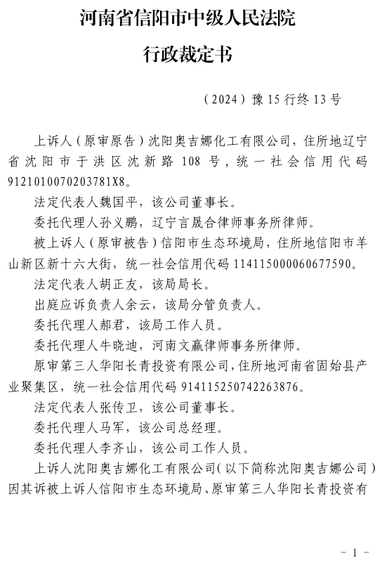 中國風(fēng)電潤滑油民營企業(yè)沈陽奧吉娜化工有限公司(下簡稱:奧吉娜公司或上訴人)訴信陽市生態(tài)環(huán)境局(被上訴人)和第三人華陽長青投資有限公司(下簡稱:華陽長青公司)行政訴訟案,河南省信陽市中級人民法院于2024年4月2日作出二審行政裁定:駁回上訴,維護(hù)原裁定。
