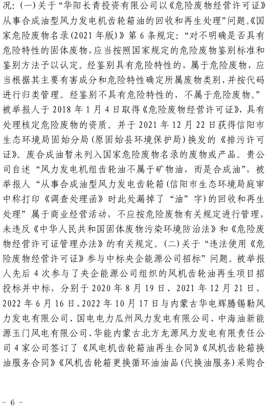 奧吉娜公司在參與各央企風(fēng)電潤滑油招投標(biāo)采購中發(fā)現(xiàn),注冊于河南省信陽市固始縣的華陽長青投資有限公司(以下稱:華陽長青公司),憑借其持有的《危險(xiǎn)廢物經(jīng)營許可證》,屢次以“風(fēng)電齒輪油再生利用”的名義中標(biāo)。然而,奧吉娜公司發(fā)現(xiàn),華陽長青公司的《危險(xiǎn)廢物經(jīng)營許可證》適用范圍并不包含合成型廢風(fēng)電齒輪油,屬于違規(guī)使用,涉嫌違反《環(huán)境保護(hù)法》。于是,2022年10月18日,奧吉娜公司依法向國家生態(tài)環(huán)境部(以下稱:環(huán)境部)進(jìn)行舉報(bào)。按程序,舉報(bào)調(diào)查由信陽市生態(tài)環(huán)境局固始分局(以下稱:固始分局)辦理。