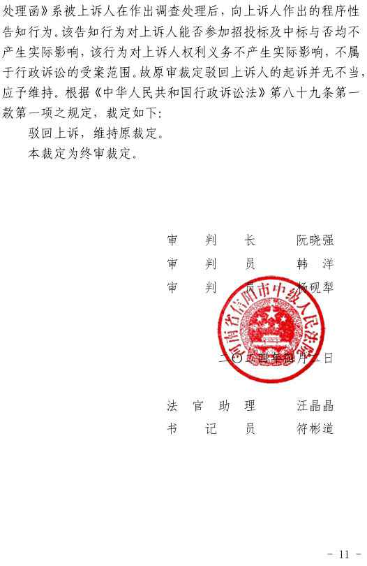 二審法院裁定的理由是:二審經(jīng)審理查明的事實(shí)與原審查明事實(shí)一致,不屬于行政訴訟的受案范圍【詳見下附一:《河南省信陽市中級人民法院行政裁定書》(共11頁)】。