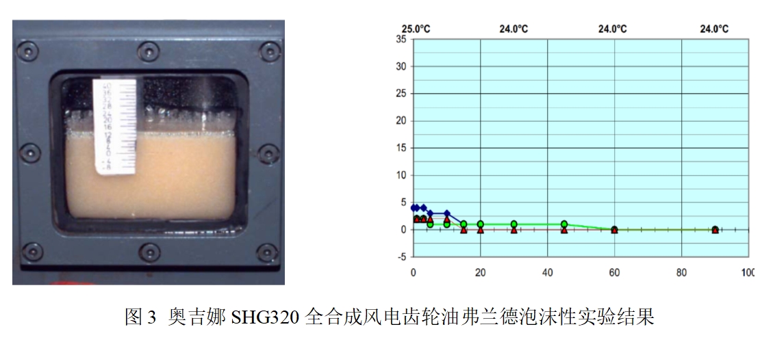 依據(jù)Flender(弗蘭德)泡沫性試驗(yàn)GG-V425的試驗(yàn)要求,對(duì)奧吉娜全合成風(fēng)電齒輪油SHG320進(jìn)行了泡沫性評(píng)價(jià)(實(shí)驗(yàn)結(jié)果見圖3),在整個(gè)實(shí)驗(yàn)過程中,形成的泡沫量不到5%,遠(yuǎn)遠(yuǎn)小于Flender試驗(yàn)要求的15%,抗泡沫性能優(yōu)越。同時(shí)消泡劑的特殊結(jié)構(gòu)也減少了過濾設(shè)備對(duì)它的吸附,使得使用過程中損耗減小,完全滿足了風(fēng)電齒輪油長壽命的要求。