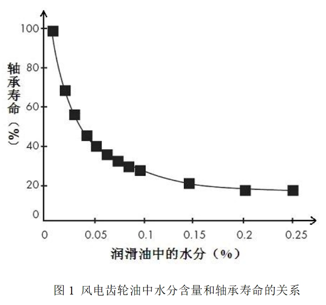 潤滑油中的水分是導(dǎo)致風電機組失效的一個主要因素。通過SKF科研人員發(fā)現(xiàn),風電齒輪油中的水分含量達到1000ppm時,軸承的壽命會降低70%(如圖1所示)。另外,據(jù)美國再生能源實驗室研究發(fā)現(xiàn),齒輪箱的失效開始于軸承,一旦軸承開始失效,其他的齒輪等部件也會出現(xiàn)相應(yīng)的問題。所以為了使風電齒輪箱達到20年的壽命,必須嚴格控制風電齒輪油中的水分。據(jù)美國齒輪箱制造協(xié)會的標準的規(guī)定,風電齒輪油中的水分要控制在500ppm以下,但是為了提高軸承的壽命,我們應(yīng)該將水分控制在150ppm以下,這樣軸承壽命會提高到原來的2到3倍。
